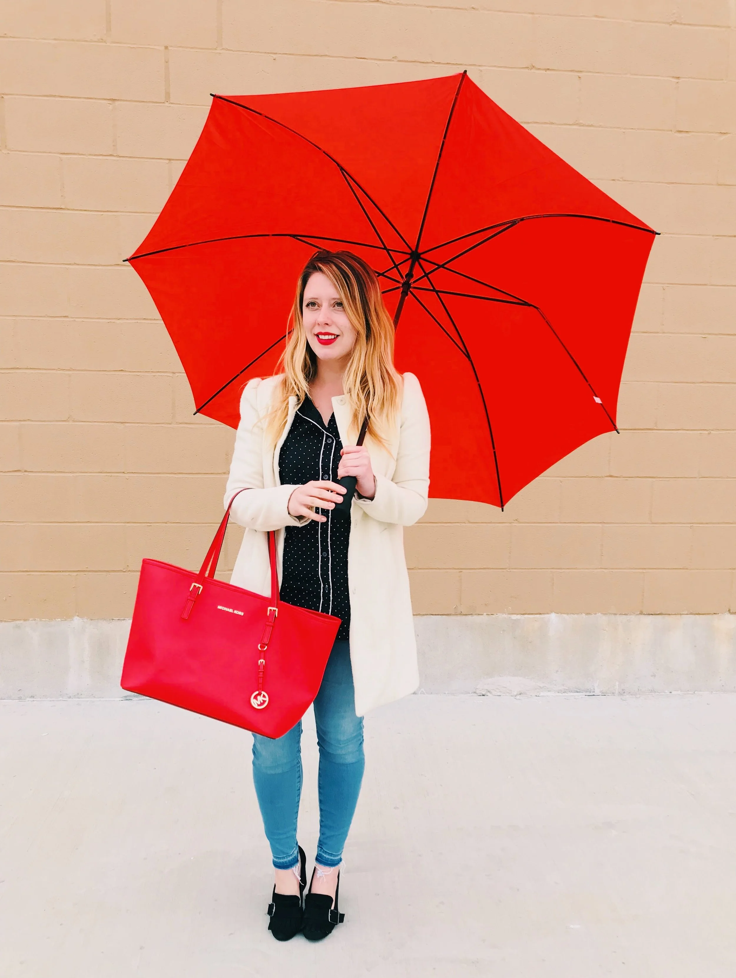 Boy has it been raining like crazy. I've been carrying this red umbrella with me at all times. I love a big sturdy umbrella instead of a collapsible folding one. I feel like when the wind is out it makes such a difference. Plus, if you're friend forgets hers you can share. Today I paired a pretty classic outfit with this red. I love these loafers I picked up last month and distressed denim. I paired it with a fun polka dot pajama like shirt and classic cream coat I've had for years.
