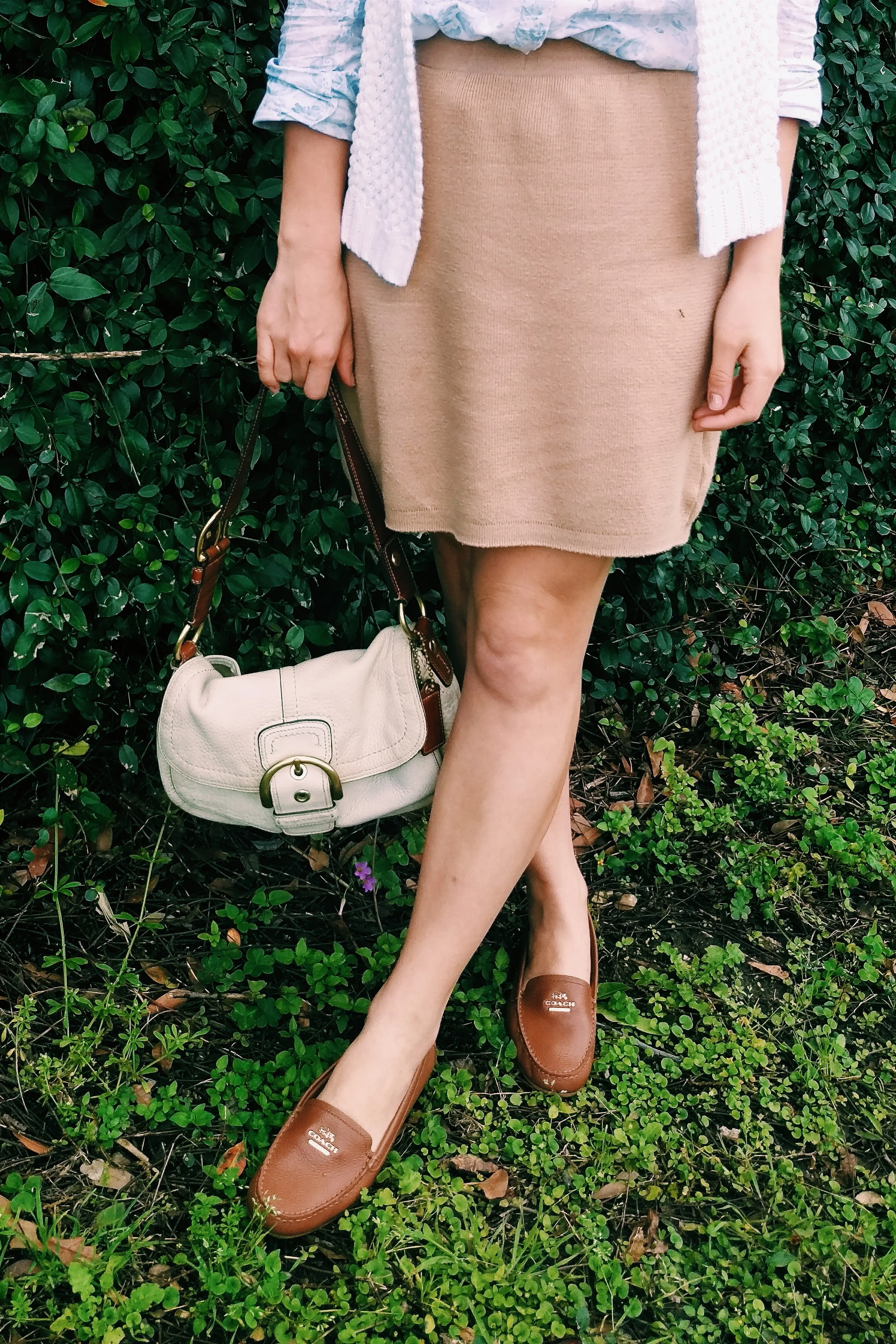 Sweater: Old // Purse: Coach // Button Up: Old Navy // Loafers: Coach // Sunnies: Circus by Sam Edelman // Skirt: American Apparel