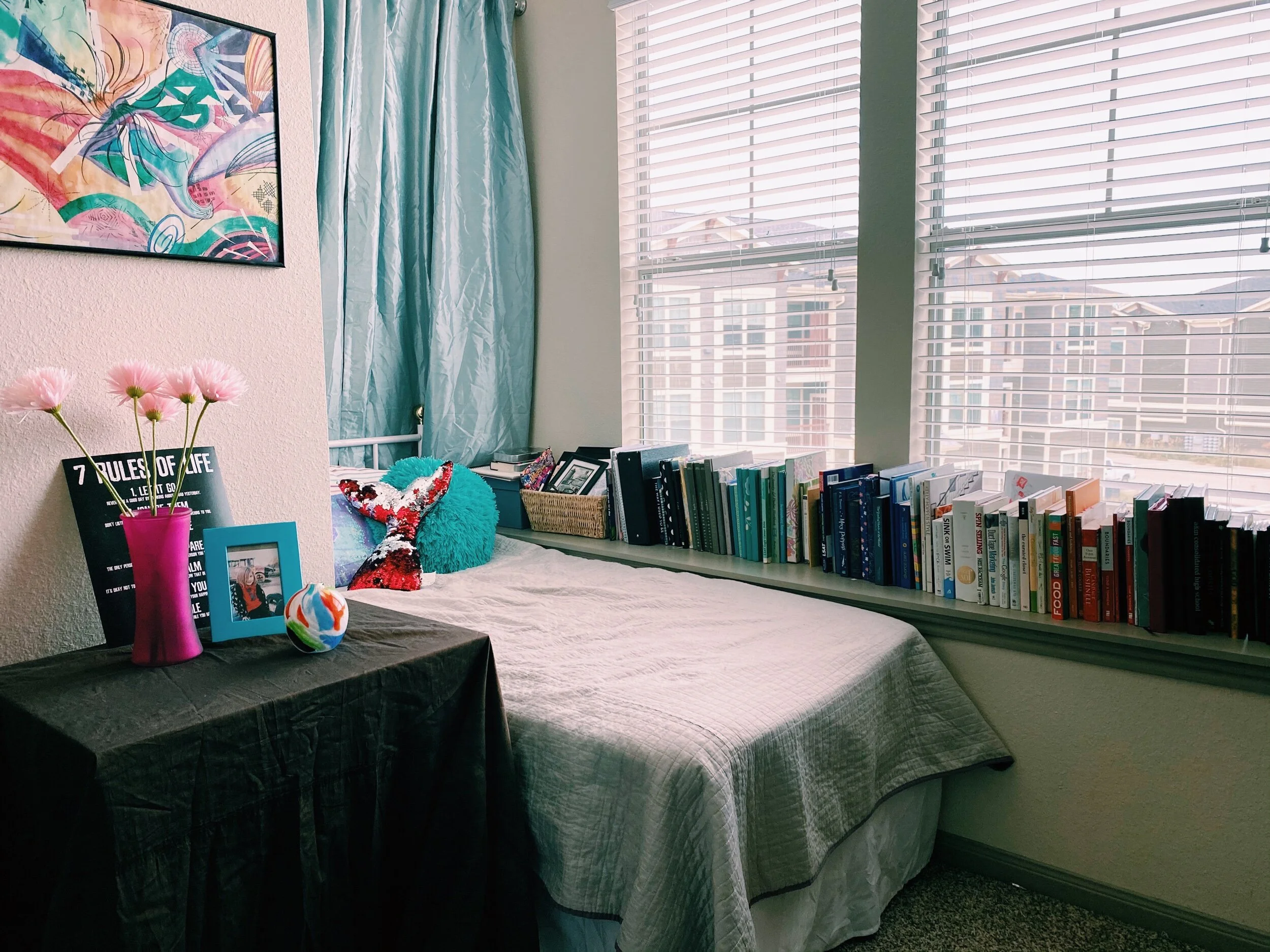 When I first moved in I had a lack of furniture for this space. I ended up purchasing during my time here new beds for both my daughter’s room and my room, a sectional, futon, and many bookcases. I moved in with just a few things but the month I added pieces until it looked and felt right. Most of my decor is very affordable. I collected items from Amazon, Wal-mart, At Home, and Target. I looked for steals and deals that fit within my budget. When I first moved in we slept on air mattresses until I could get new mattresses and frames purchased. Looking back I cannot believe how much progression happened over the year. This is a prime example of thinking something into existence.