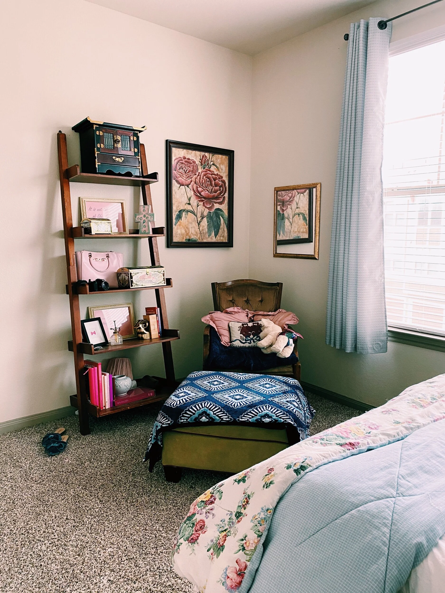 When I moved in I was working completely from home and knew having a third bedroom for an office and guest room was vital for my mental health. Being able to shut the door in the evenings to my office made it easier to create a boundary between work and home life. One of the biggest struggles for working from home is having boundaries and downtime. I made sure to be “off work” when I was done with my day. In that same room, there is an extra door leading to the bathroom. Because the hallway also has a door to the bathroom I decided to put up curtains and a tension rod as a backdrop for the guest bed. It created a beautiful little reading nook for late afternoon or weekend reading. My daughter had distance learning all year long and would come to hang out doing her school work here throughout the year. Such fond memories of this room!