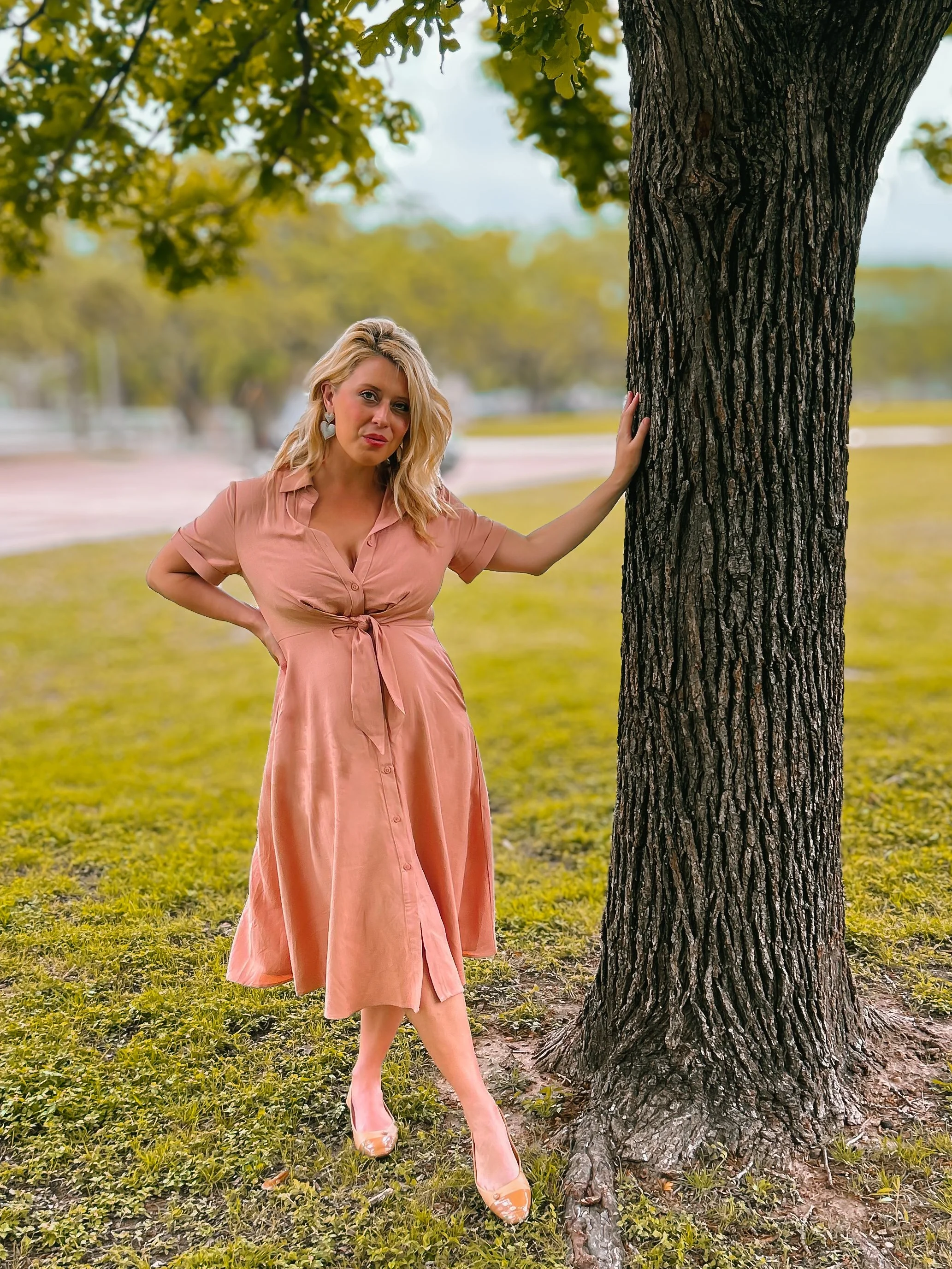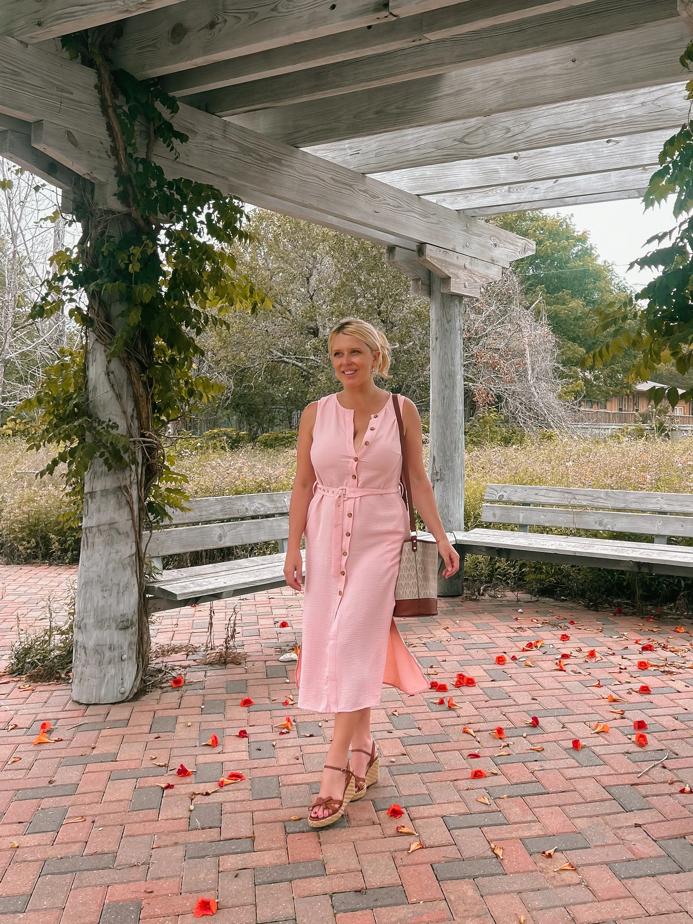 I love a classic shirt dress and this one has such a great feature on the front that ties so you can adjust it easily! This is one of the most universally flattering shades of pink on almost any skin tone.