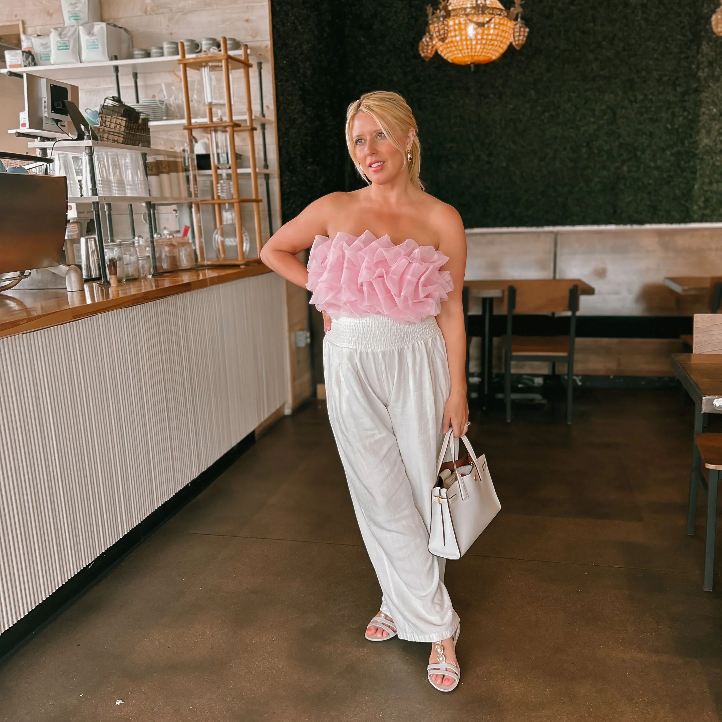 This top gives me all the girly feels! I paired it with classic wide-leg linen pants for an effortlessly chic look. Will be wearing it again with shorts! You can add the items to your cart here.
