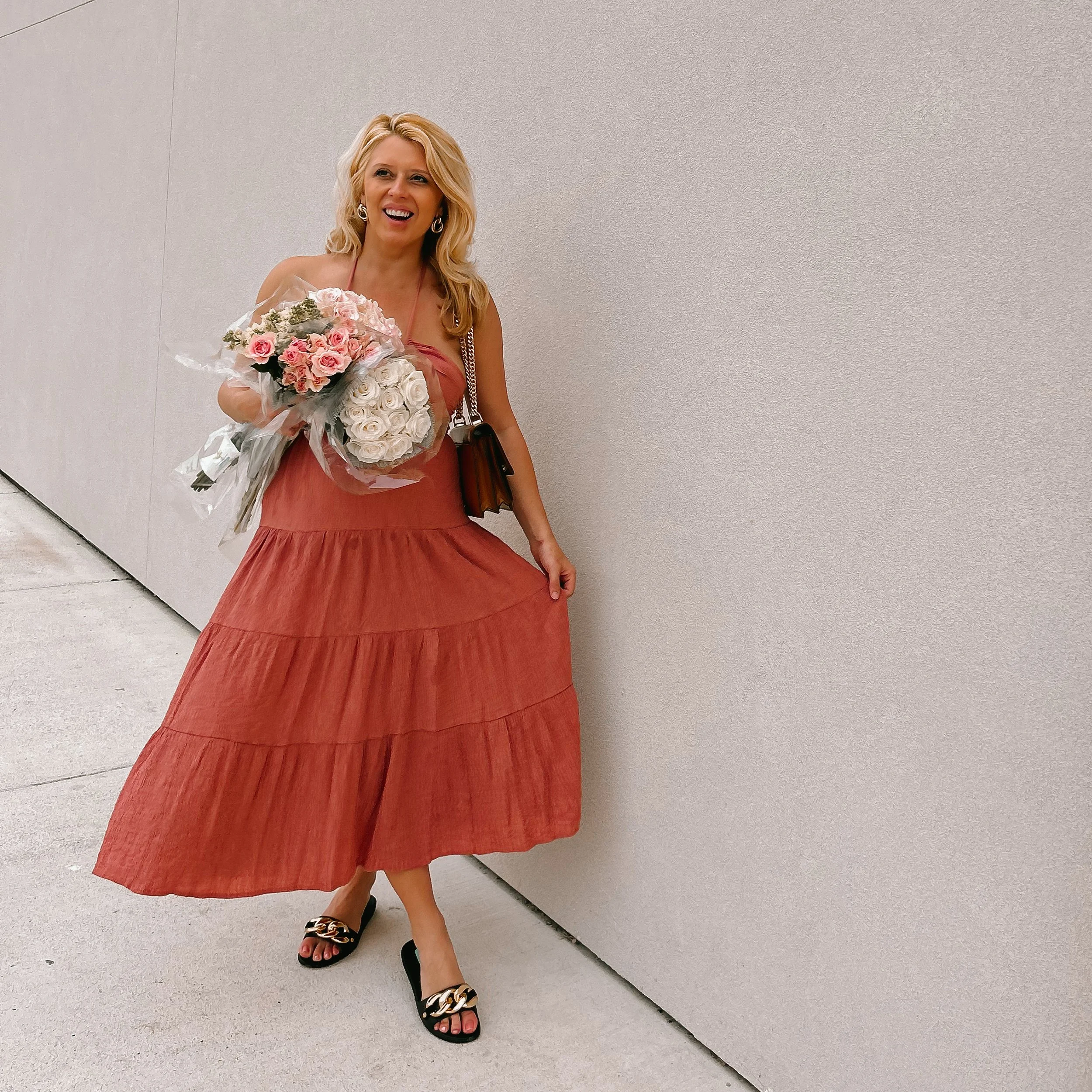 Love a pretty rose-colored dress for this time of year. If pale pink or hot pink aren’t your thing then consider reaching for a more earthy shade of pink like rose! This dress has a stunning neckline and the cut of the skirt makes you feel like you are floating.